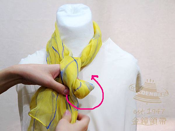 蝴蝶結的結法相當簡單,只要注意打結的方向正確,就能把蝴蝶結打的很漂亮。 首先,先把絲巾中間掛在脖子上。
