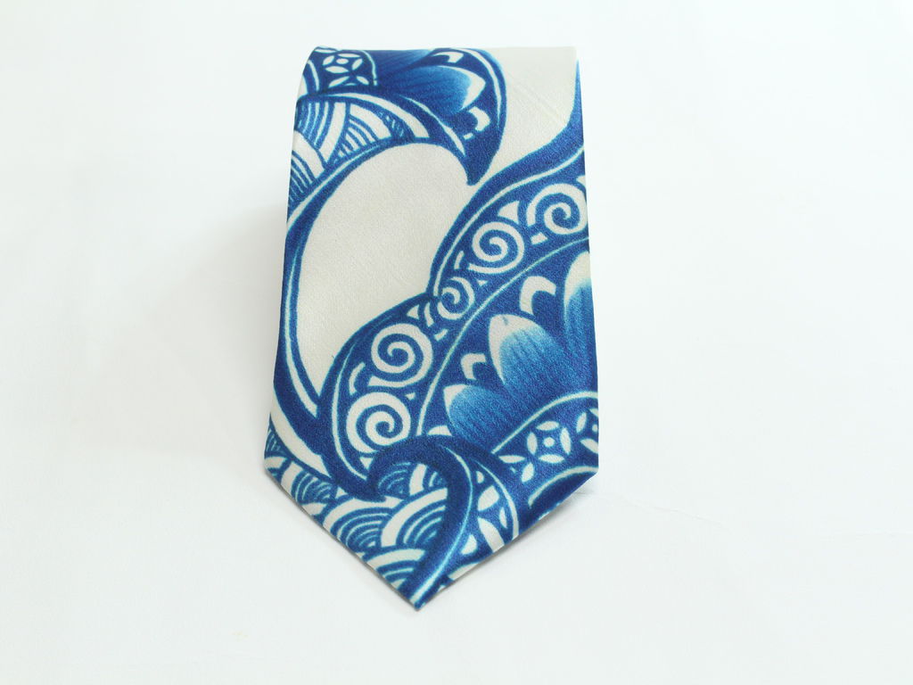金鐘領帶的文創設計團隊經與錢宜琳大師一來一往多方面討論, 最後定調以具有中華民族審美理念代表的--白地藍花青花瓷系列 展現在領帶與絲巾上面。