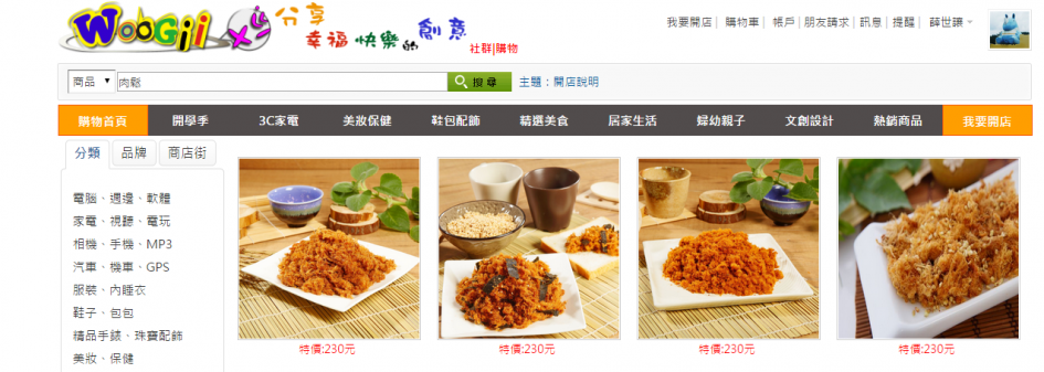 仔細看看桌上滿滿的菜, 好像少了喜歡吃的肉鬆跟肉乾, 趕快上 WooGii 第一社群購物平台採賣去, 搜詢"肉鬆" 跑出來好多個好吃肉鬆~