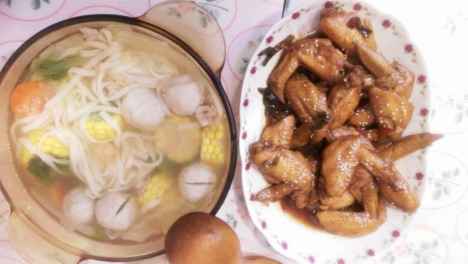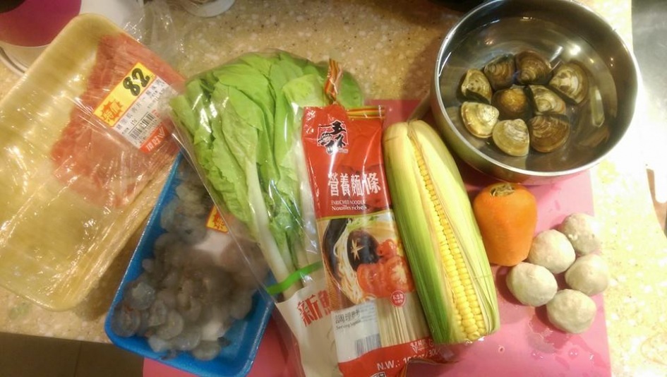 除了“可樂滷雞翅”當主菜,另加“海鮮什錦湯麵”當主餐。 首先準備主餐~裡面有青菜, 貢丸, 玉米, 葛麗, 麵條等好料的~