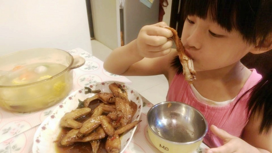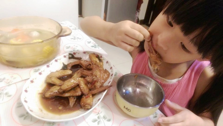 看momo大啖吮指的表情,呵~滿足到想灑花呢。 MOMO吃雞翅可愛表情三連拍~