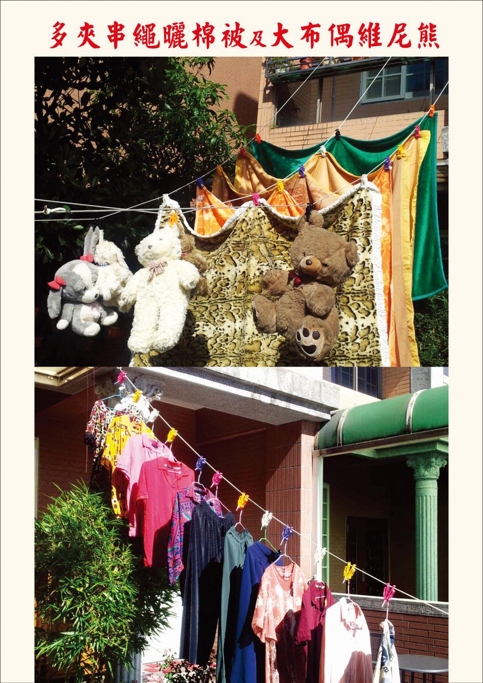 連續多日陰霾看到有天氣放朗跡象,趕緊將毛毯、棉被及小孩的玩偶通通拿到外頭太陽底下曝曬,免得塵螨作祟全家過敏難以安眠。多夾串繩後,繩子的一端從高處綁住後丟下,另一端直接綁於圍籬上;棉被、毛毯因為超重的,所以一次用三條平行的多夾串繩,棉毯兩端及中間點各塞進夾子裡(夾子最大開口達2.54公分一個英吋粗水管),再用平時衣服撐架逐一逐次地往最高點推高,這樣連續推上了好幾條,最後把小明、小瑛的布偶也夾上(一隻布偶起碼有三、五公斤,真重耶!),就這樣半天時間就利用陽光自然完成殺菌了,不再像以前用竹竿要換邊曬,要曬一、兩天,碰到變天還要急急收回,折騰半天,這一陣子全家大小可以高枕無憂,永保安康了….。