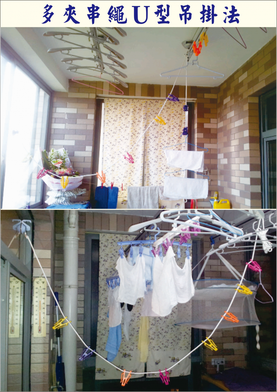 一對夫婦自從生下可愛的小寶貝後,為了換洗小孩衣服忙得不可開交;小孩換穿尿布、衣服時,經常邊換邊屎尿,一次要換上五.六件稀鬆平常,雖然洗衣機隨時備洗著,小孩衣服仍然跟不上而乾不了、還沒地方吊曬,加上家中每天固定要洗的衣服約幾十件,遇上下雨天更是潮濕難乾,經常煩惱不已;自從朋友介紹輾轉得知『無敵萬用吊掛組』多夾串繩可利用狹小陽台空間,智巧性的以無敵金剛夾串繩附掛固定陽台短邊兩頭做成U型吊掛後,不但沒有影響原來長邊原有的吊曬衣物功能及數量外,還能有效利用下擺處吊曬小孩衣服,沒想到一條繩可串掛20幾個夾子,一次吊曬20幾件衣服,這樣一天吊曬衣服竟可多出好幾十件以上(下擺多處U型吊掛),至此再冗長的雨季都不再擔心了。