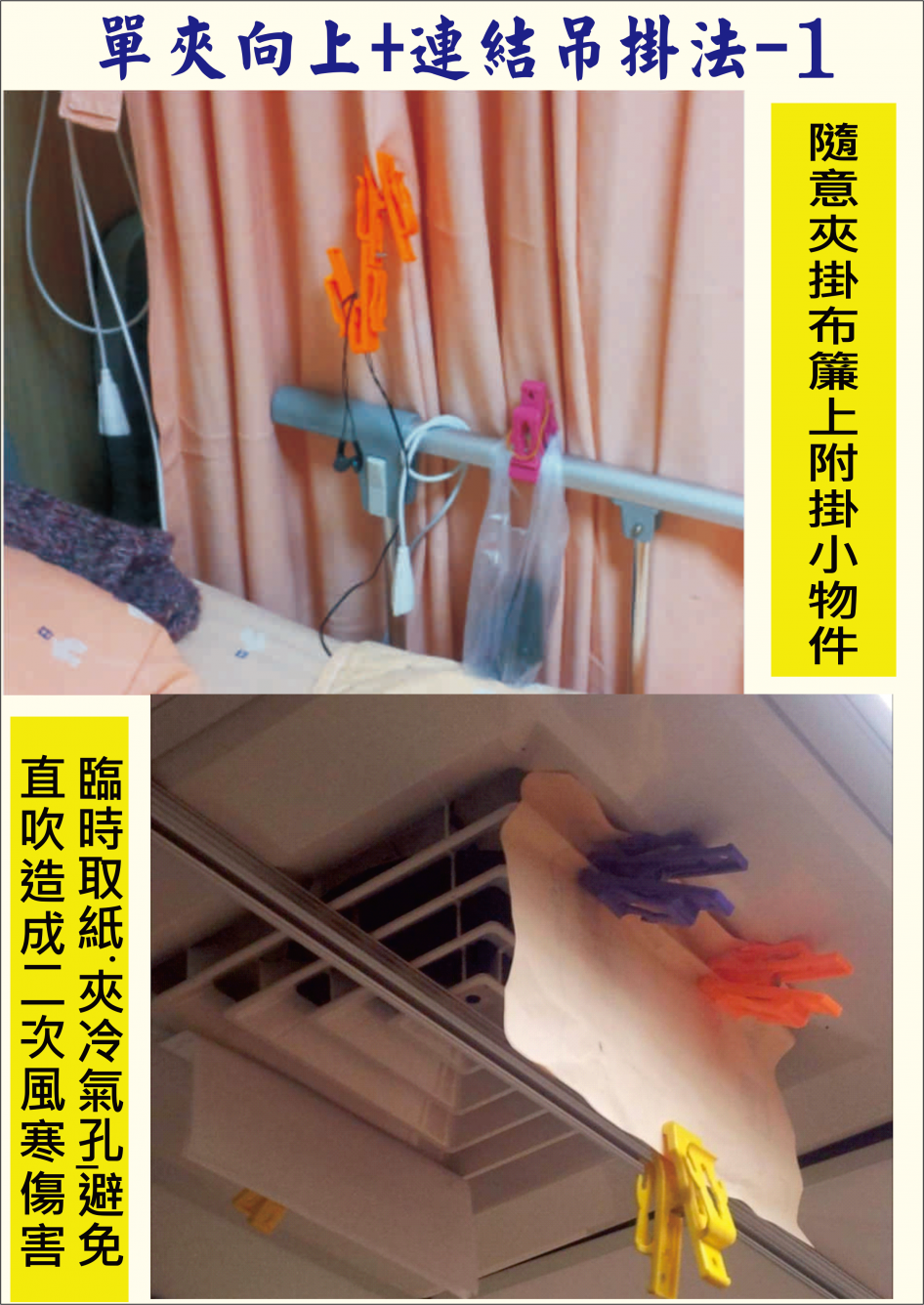 有一天老人家住院我晚上去探望,雙人房間中間隔著落地布幔做為私密的楚河漢界外,病房裡僅有一桌一椅一注射吊桿,超冷的空氣夾雜著藥味特顯蕭瑟與肅穆;那晚我特地帶了小點心熱食及隨身聽期能酷愛音樂的她能調劑身心快些出院;當下卻發現桌椅床等擱哪都不對,我當時思索著用隨身攜帶的金剛夾直接向上夾住布幔,將隨身聽、耳機等附掛於夾子臂彎側邊的小彎勾上,發現超好用的,既不會找不到東西又垂手可得,金鋼夾開口可達2.5公分寬,夾定在病床邊圍桿及輪椅邊桿甚是容易,使用超方便的;隨後內人告訴天花板冷氣孔向下直吹晚上難以消受,我看了以後試著拿起夾子及幾張現成的A4紙張夾住冷氣孔出口鐵條,讓直洩的冷氣改變風向、不再擴散而免於受寒,哈!動動腦這種場合竟也能派上用場,真棒。